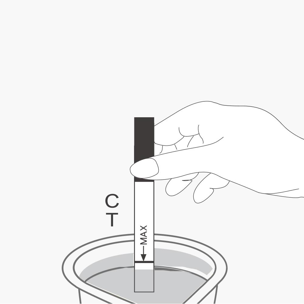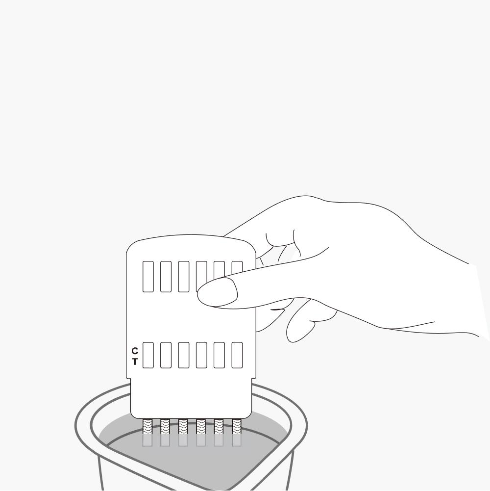 2. Sciągnąć obudowę z panelu testowego, trzymając pionowo panel testowy zanurzyć końcówki pasków testowych w próbce moczu przez ok. IO-15 sekund. Mocz powinien sięgać co najmniej do poziomu falujących linii zaznaczonych na paskach, ale nie może dotykać panelu testowego.